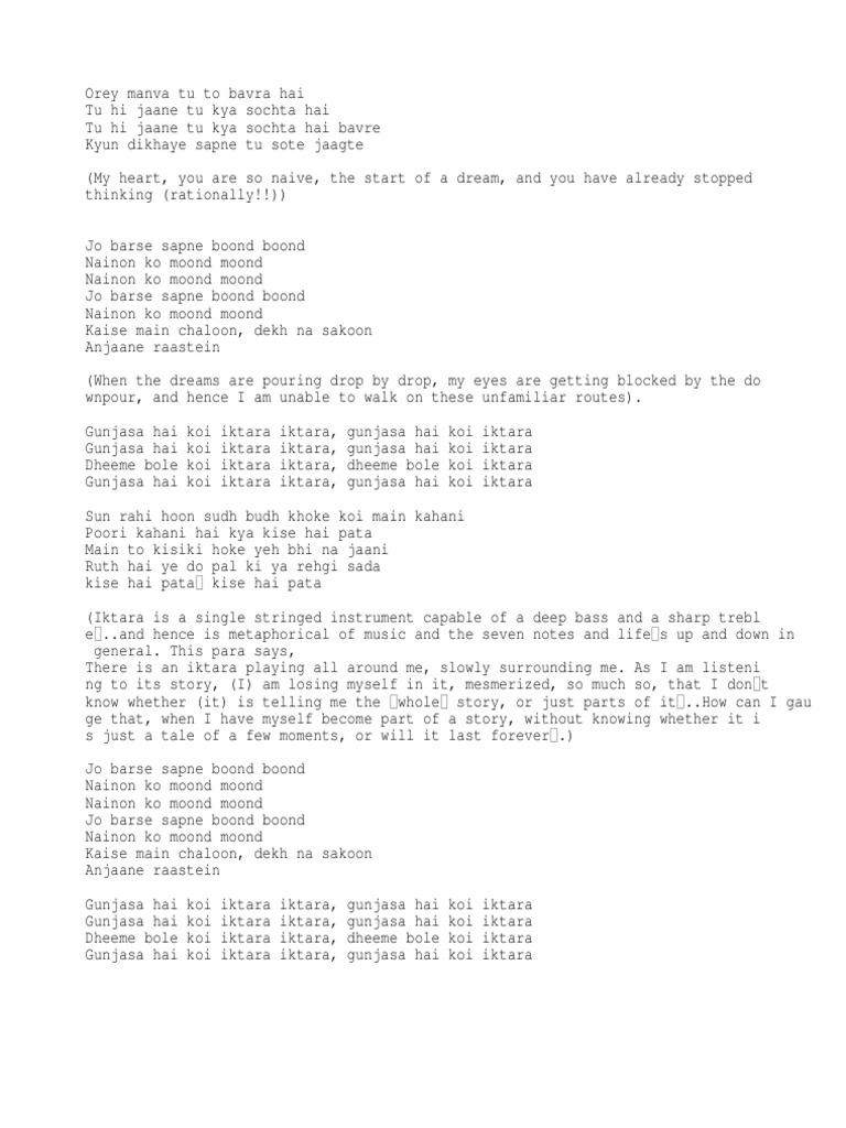 Iktara Lyrics In Hindi Goonja Sa Koi Iktara Iktara Song Lyrics In English Free Online On Gaana Com Orey manva tu to bavra hai tu hi jaane tu kya sochta hai tu hi jaane tu kya sochta hai bavre kyun dikhaye sapne tu sote jaagte.